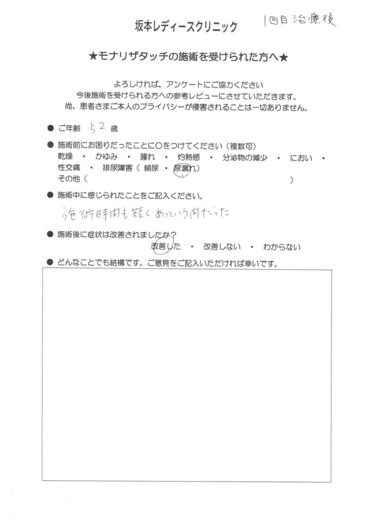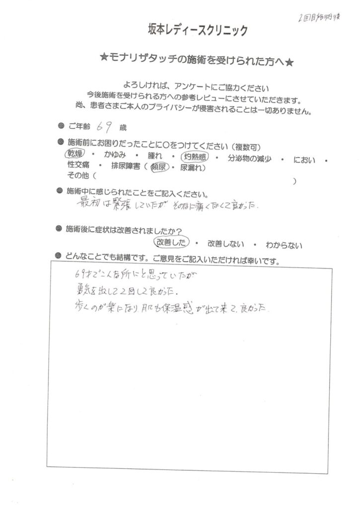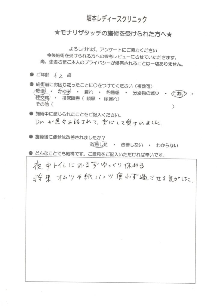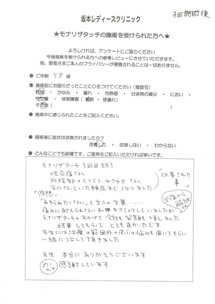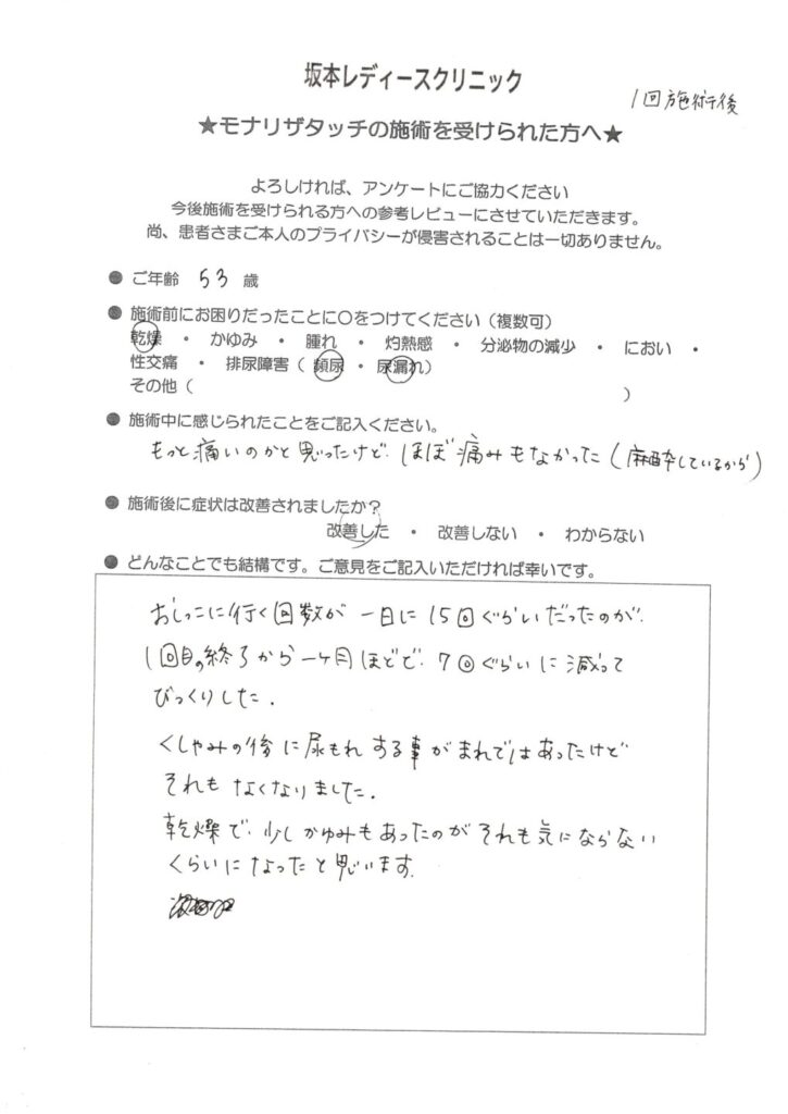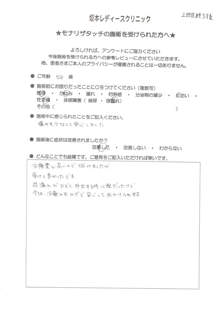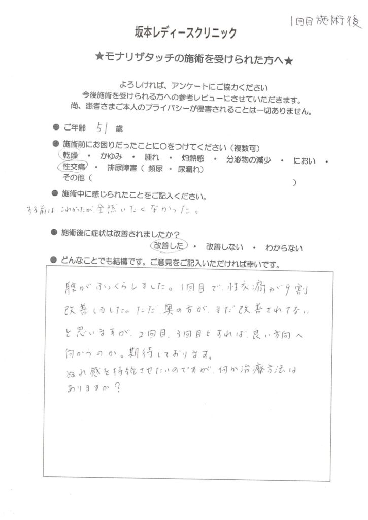坂本レディースクリニックでは、モナリザタッチ治療を受けられた患者様に、治療後のご感想をアンケートでお伺いしています。