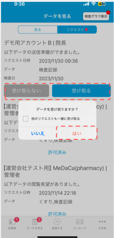 ↓内容を確認し、データを受け取りますか? 「 はい 」を選択