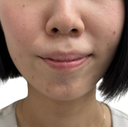 【施術2週間後】オトガイ筋が弛緩することで過活動が改善しており、正面からのなめらかなVラインは戻り、わすかにあごが出るようになるきれいなEラインが形成されています。