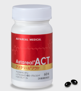 アスタキサンチンはβカロテンやトマトに含まれるリコペンなどと同じカロテノイド(色素)に一種で、自然界、特に海洋に広く分布する食経験豊富な赤い色素です。優れた抗酸化作用を持ち(CoQ10の800倍、ビタミンEの1000倍、ビタミンCの6000倍)、体を守る力は天然成分の中でもトップクラスといわれています。アスタリールアクトには、アスタキサンチン、トコトリエノール(ビタミンEを構成する成分)、Lアスコルビン酸2グルコシド(安定型ビタミンC)が含まれています。
