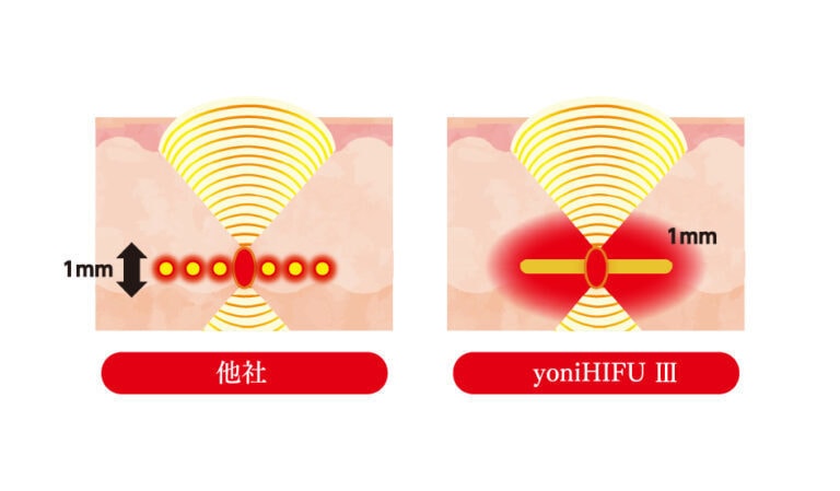 当院で導入している最新型の yoniHIFUは、点ではなく 面での照射が可能なため、照射ムラが少なく、 1回の施術でも効果を実感しやすいことが大きな特徴です。