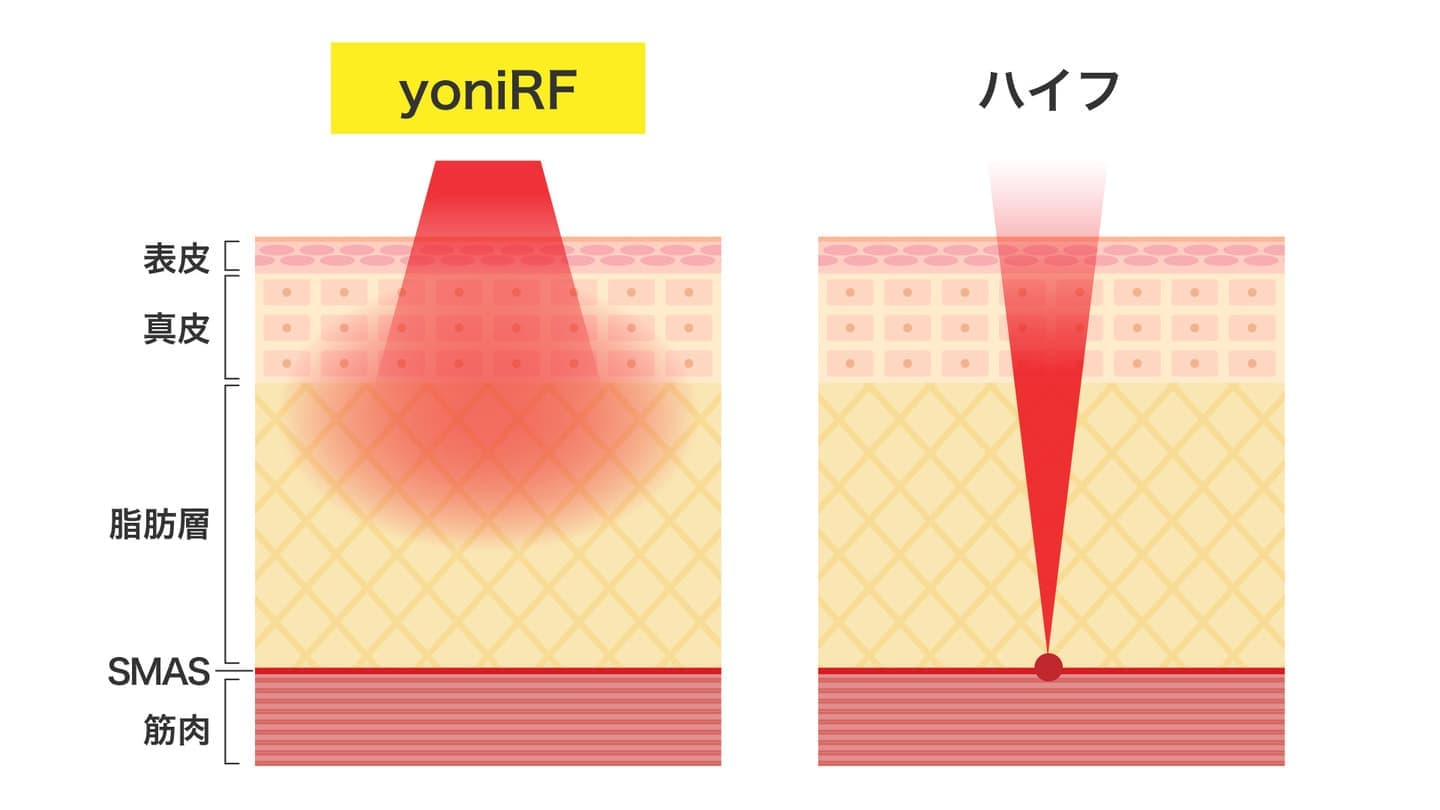 yoniRFは、腟粘膜下に超音波の熱エネルギーを与えることでコラーゲンの産生を促進し、腟のハリや厚みを回復させます。